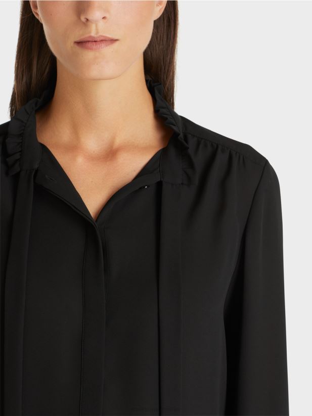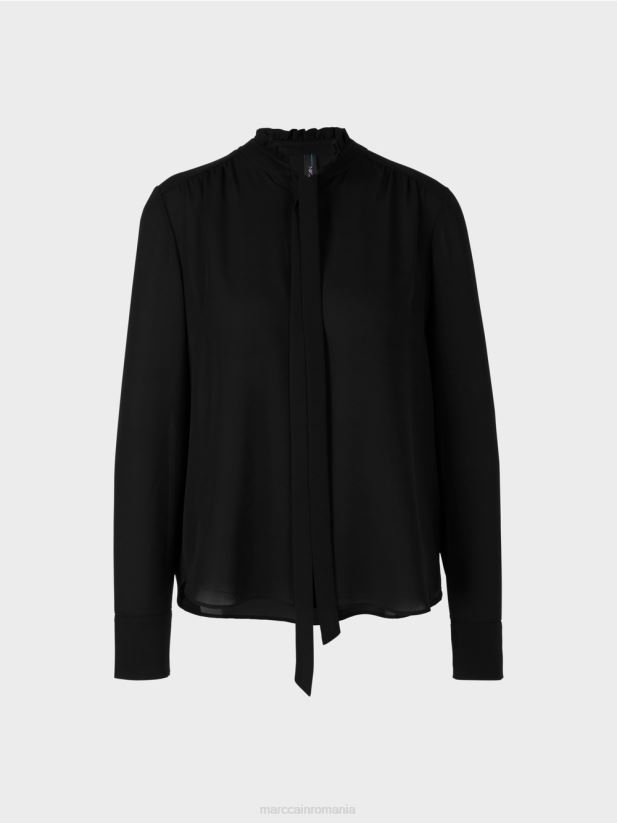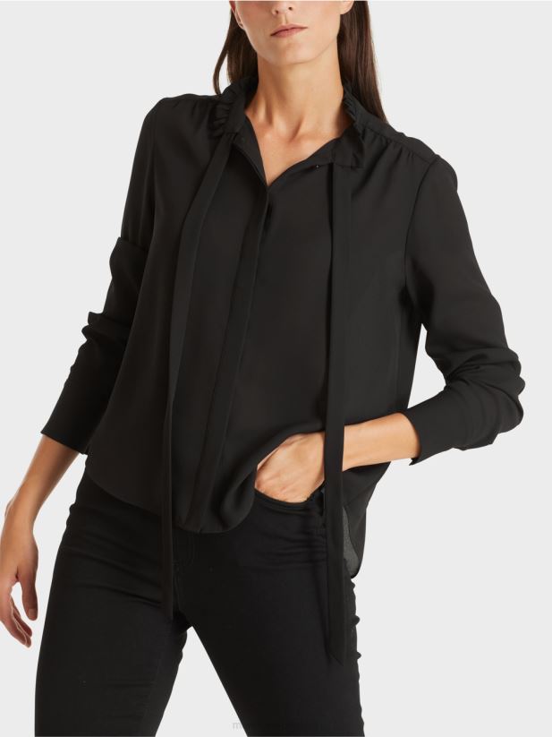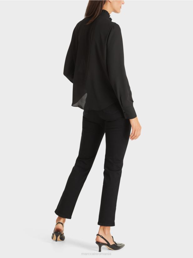 bluza fluidă captivează prin aspectul său feminin. gulerul este decorat cu volane mici, iar bucla îngustă poate fi transformată într-o fundă frumoasă. Manșete elegante cu doi nasturi, placheta ascunsă cu nasturi și spatele ușor alungit completează designul.