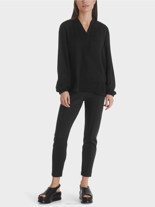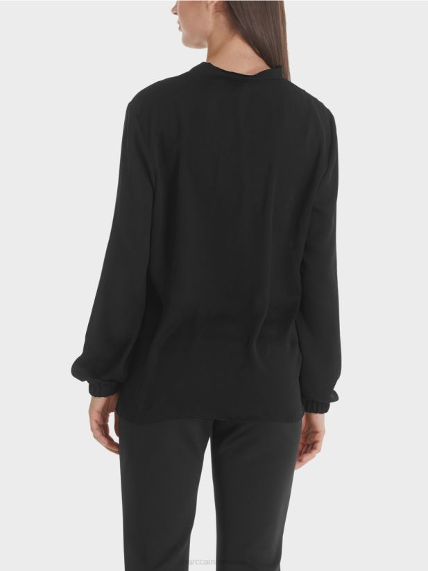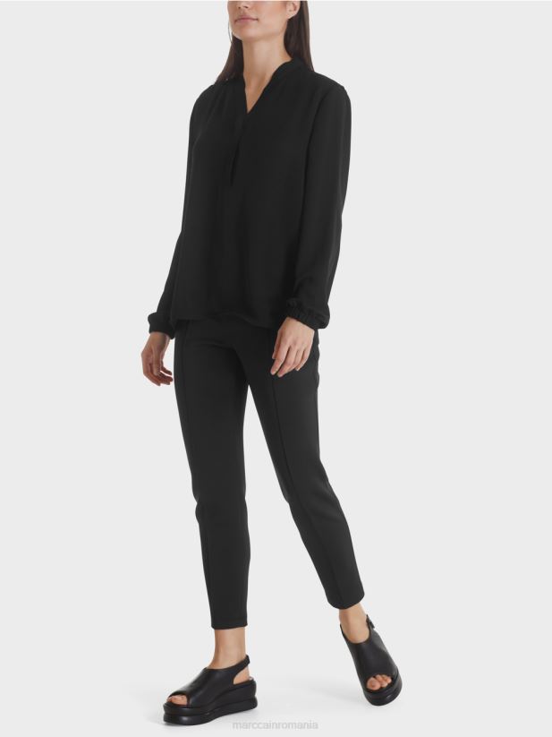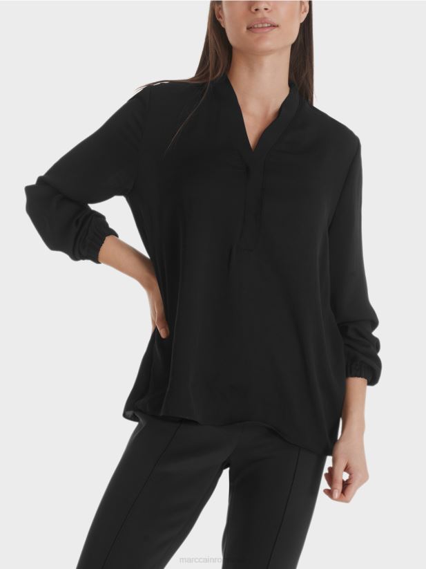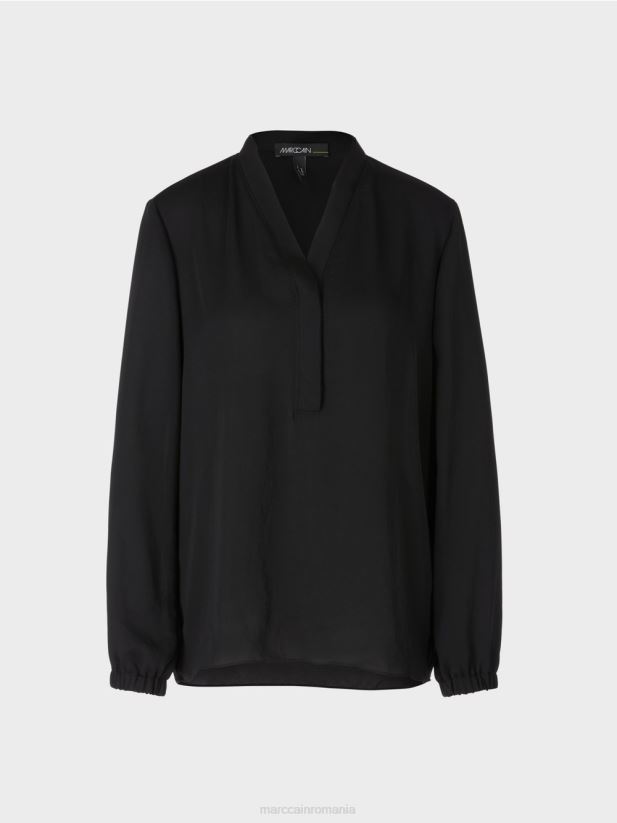bluză necomplicată din microfibră fluidă, ușor strălucitoare, cu mâneci lungi. bluza lată este împodobită la decolteu cu margini cu volan dublate și tăiate care conferă designului un aspect feminin. o bandă elastică este încorporată în manșete.