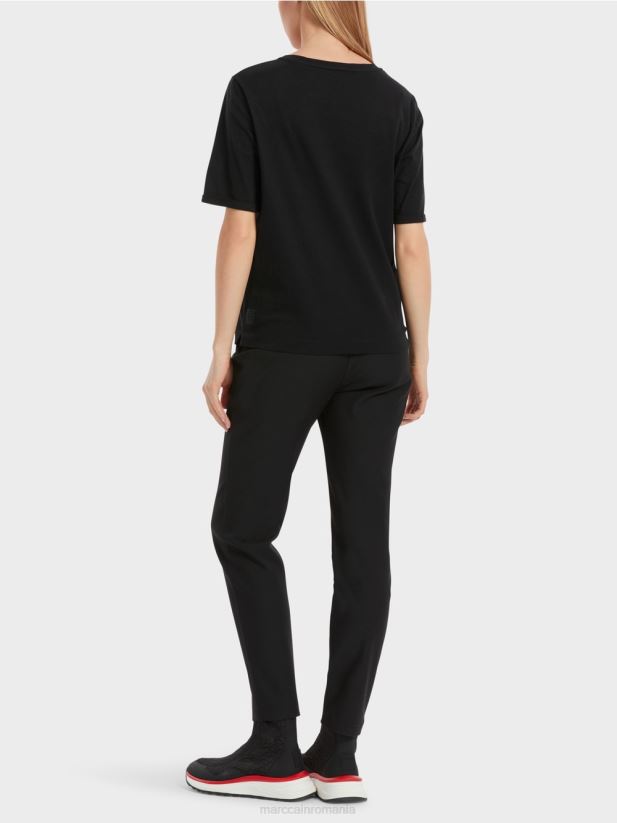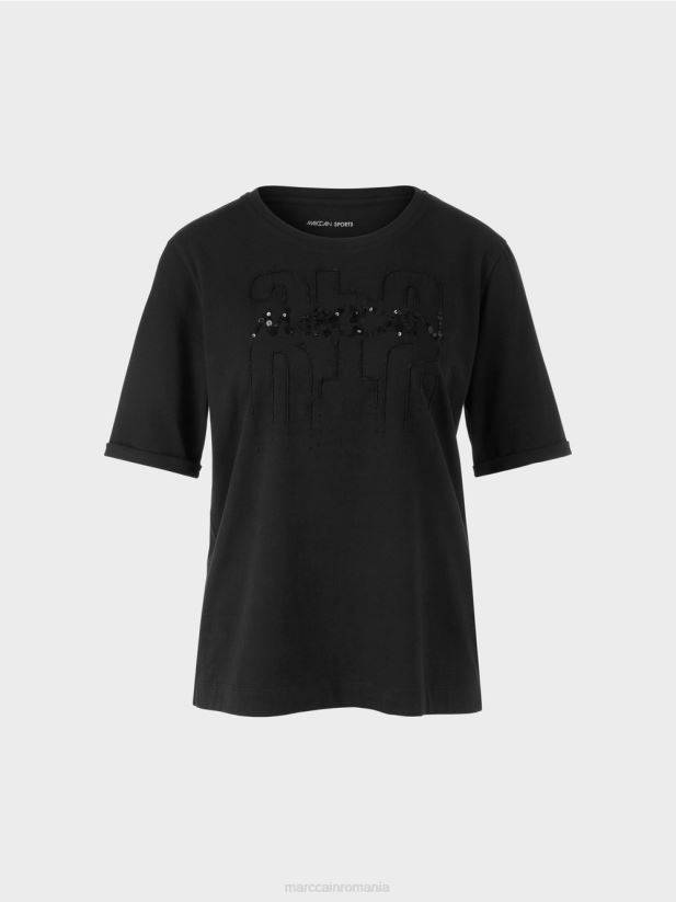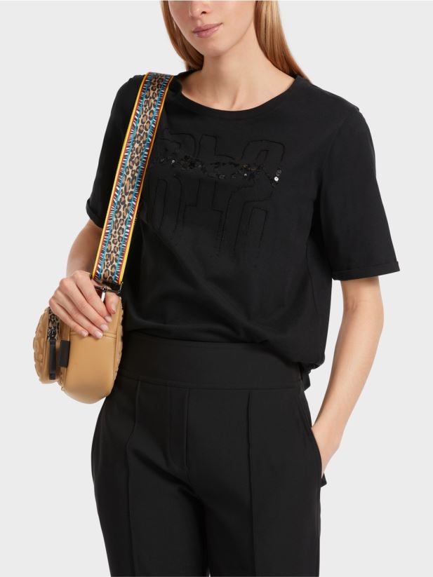tricoul este din bumbac pur. croiala este îngustă în zona umerilor și obișnuit lată de la inserția mânecii în jos. mânecile scurte au manșete mici. partea din față prezintă un motiv script aplicat cu margele și paiete.