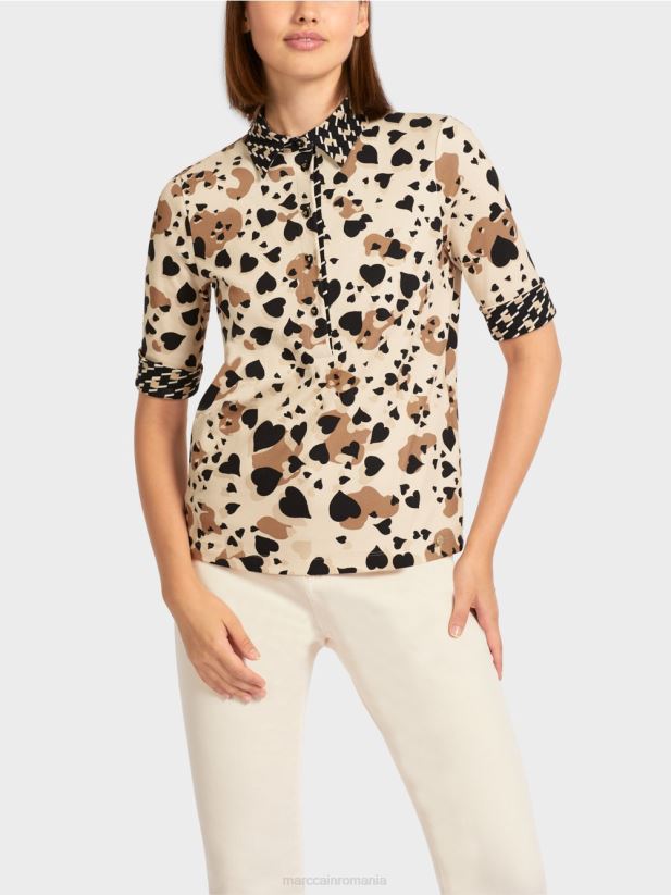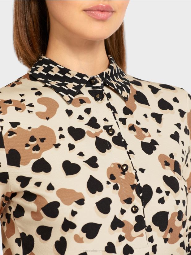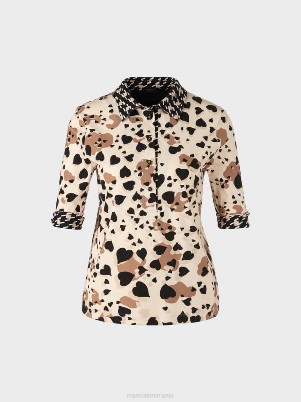 cămașă ușor îmbrăcată, cu guler polo în model contrastant și cu clapetă cu nasturi. acest tricou polo are un design de leopard în formă de inimă, cu accente în carouri de cioban. este confecționat dintr-un jerseu de bumbac confortabil, cu o textură striată. mânecile trei sferturi pot fi suflecate lejer. decorul inimii de pe butoane adaugă o notă frumoasă.