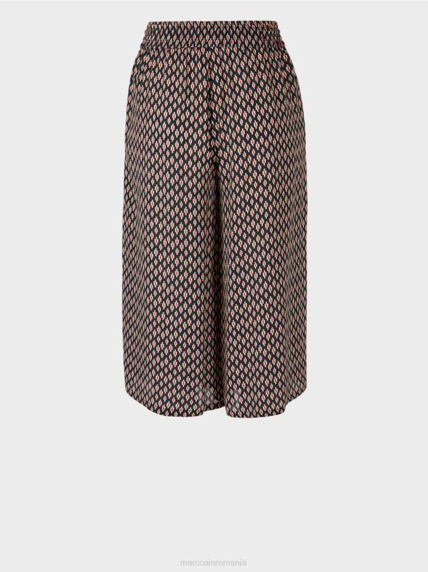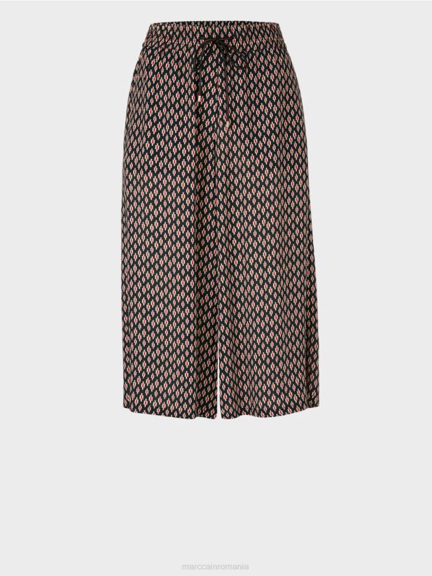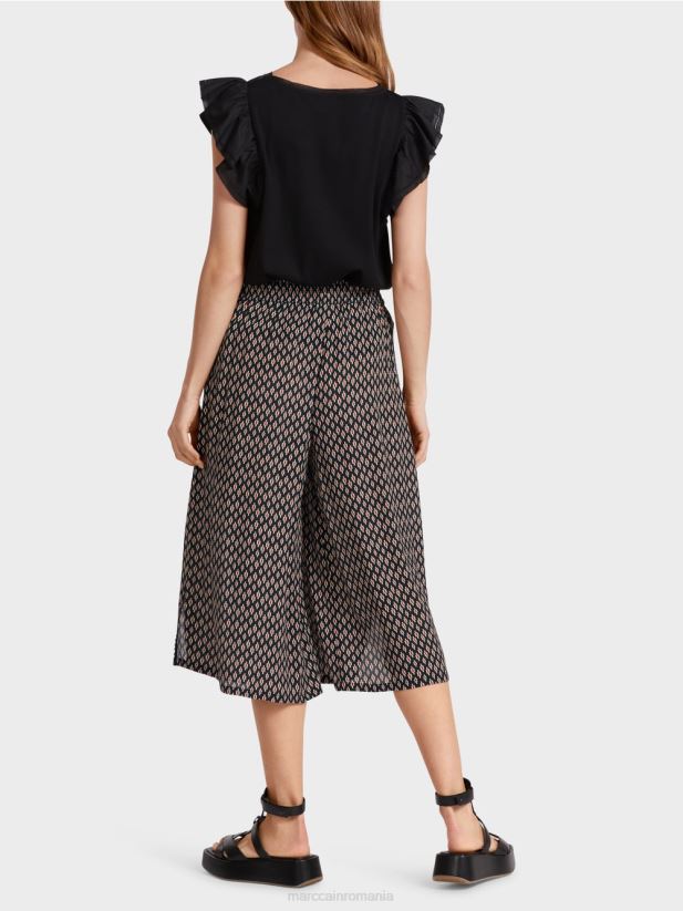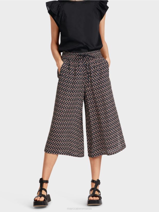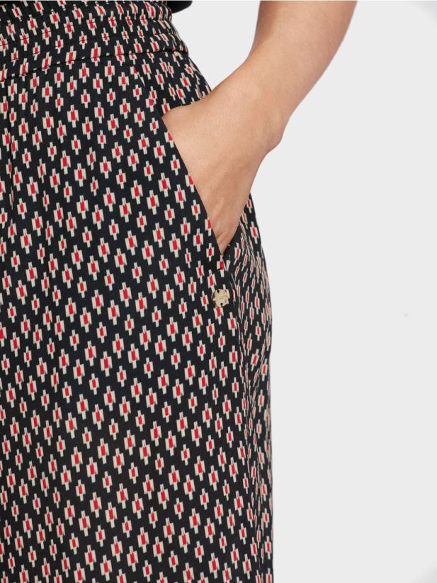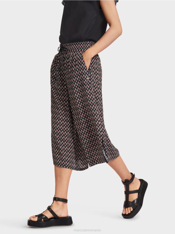 pantalonii trei sferturi sunt tăiați lat și confecționați dintr-o calitate de viscoză fluidă și ușoară. fantele laterale lungi sunt tăiate cu dantelă îngustă, iar talia confortabilă are șnur pentru o potrivire perfectă. eticheta mică cu logo de pe geantă adaugă un accent deosebit.