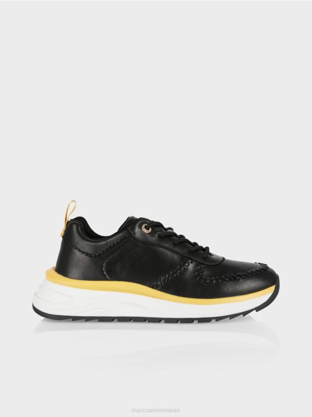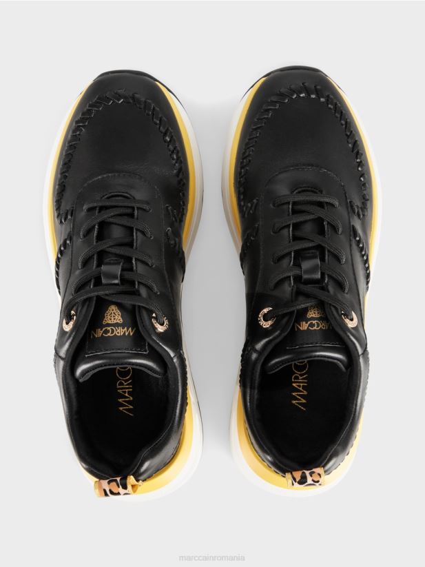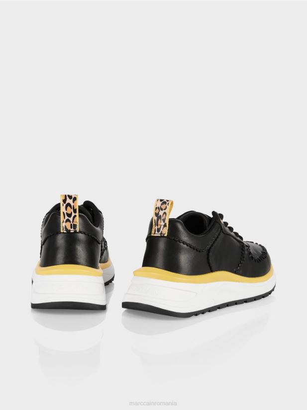 adidași contemporani din piele. acești adidași clasici se prezintă cu detalii contrastante, precum și cu ornamente jucăușe împletite. au o formă rotunjită și, datorită căptușelii, punctează foarte mult când vine vorba de confortul la purtare. talpa de cauciuc este evazată la călcâi și decorată cu litere marc cain. o filă specială le face ușor de pus și scos.
